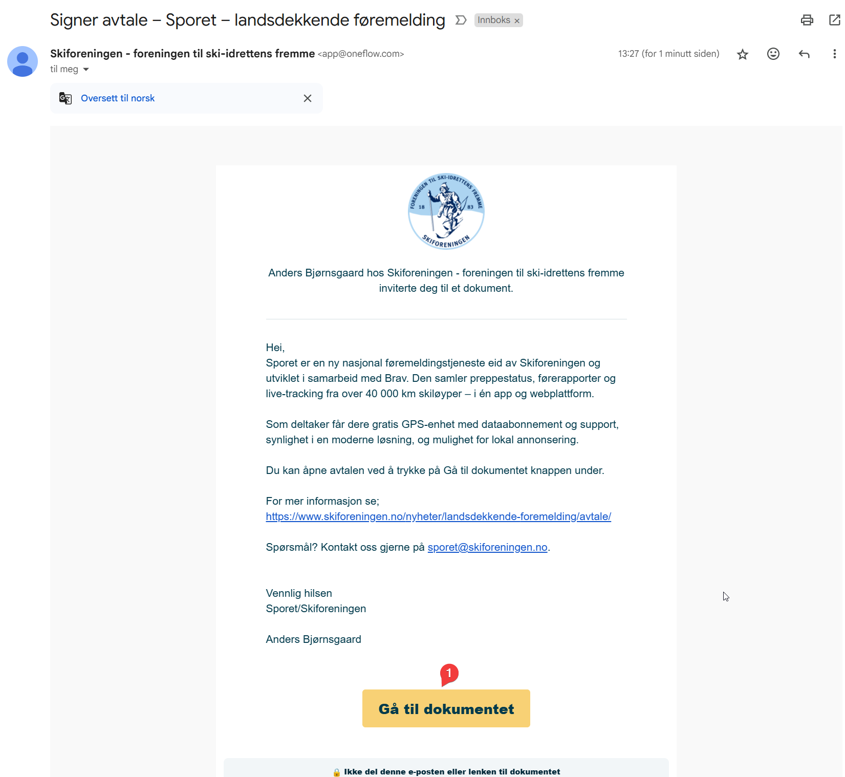 - Trykk på Gå til dokumentet knapp i epost med avtaledokument